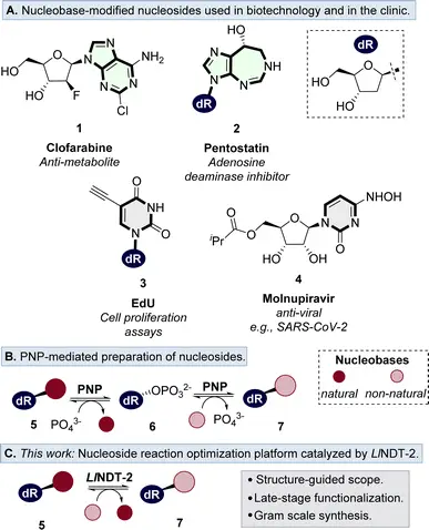 Gram-scale enzymatic synthesis of 2′-deoxyribonucleoside analogues using nucleoside transglycosylase-2
